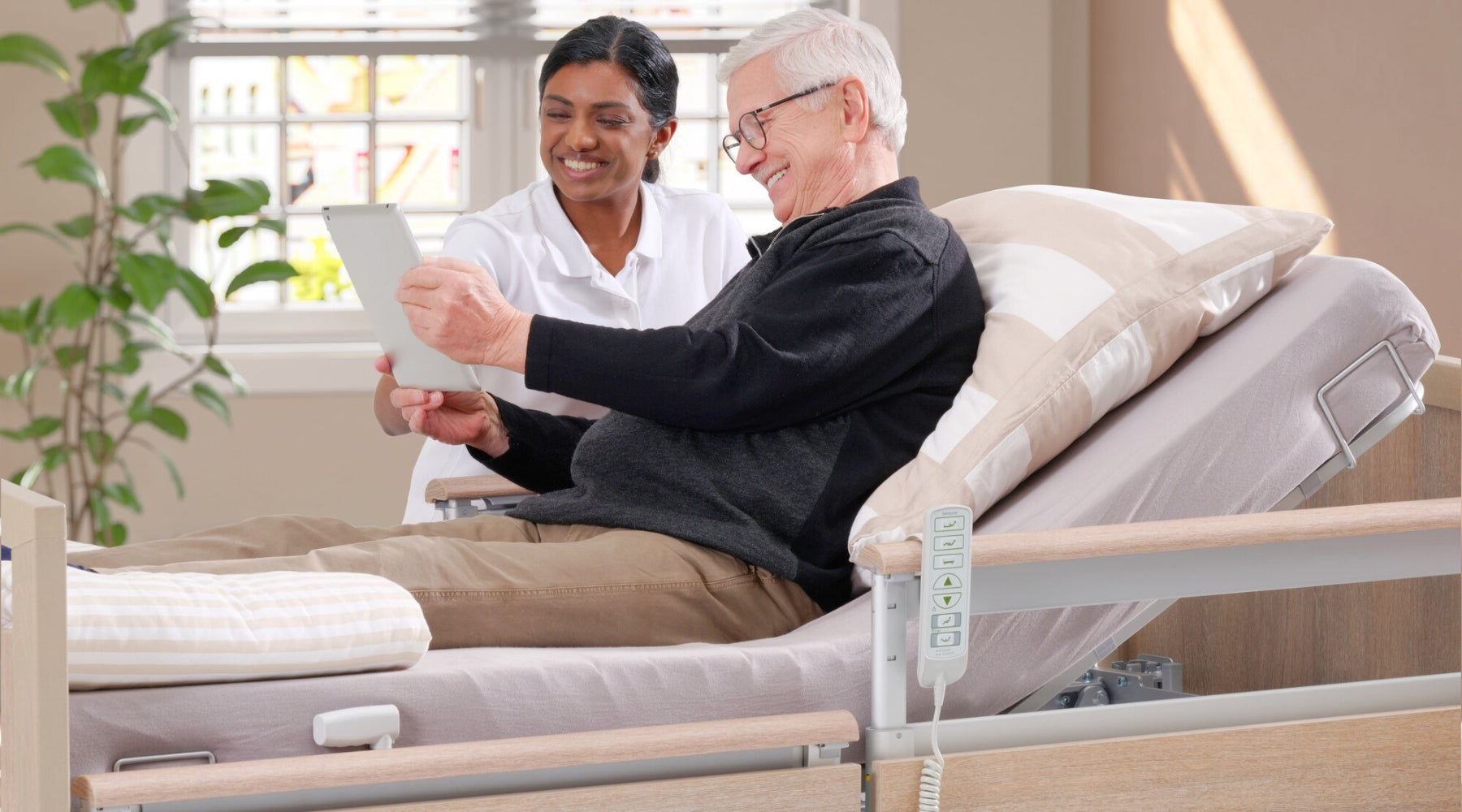 An Integrated Bed Extension up to 20cm allows more comfort for taller patients and it comes with a Smart Handset with 3 modes (Nursing, Resident and Locking Mode)