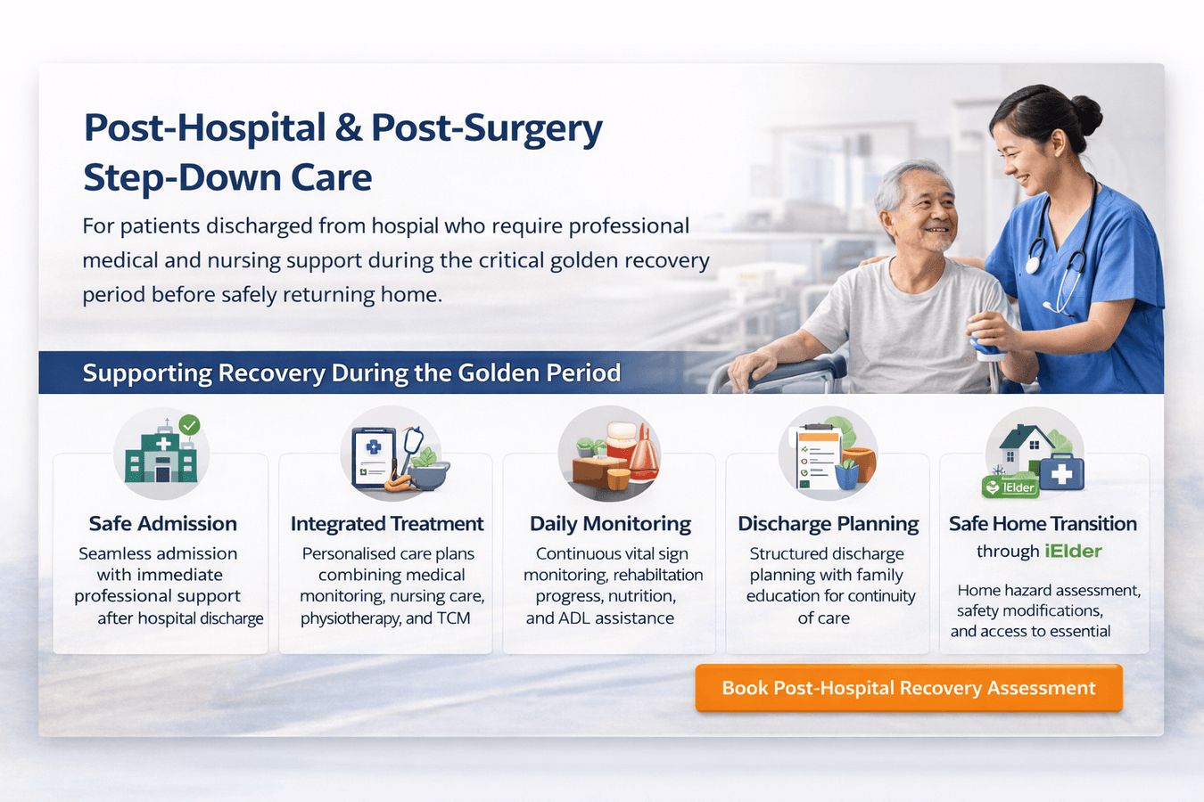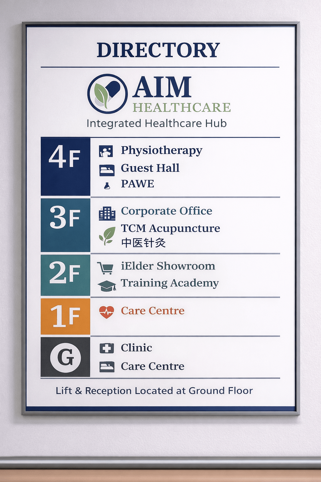 AIM Healthcare specialises in post-hospitalisation and post-surgery recovery care, supporting patients during the critical golden recovery period through coordinated nursing care, medical monitoring, physiotherapy, and TCM herbal medicine and acupuncture. We also provide structured home transition support, including home care products, hazard assessments, and home safety modifications.