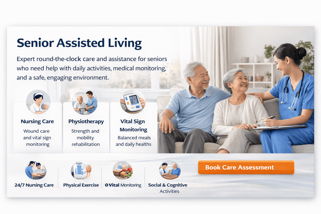 For seniors and the elderly, we offer respite, day care, short-term, and long-term care, managing common age-related conditions such as dementia, Parkinson’s disease, stroke, heart conditions, hypertension, and osteoporosis. Our care programmes include nutritional meals, daily exercise, cognitive activities, vital sign monitoring, and assistance with daily living (ADL).