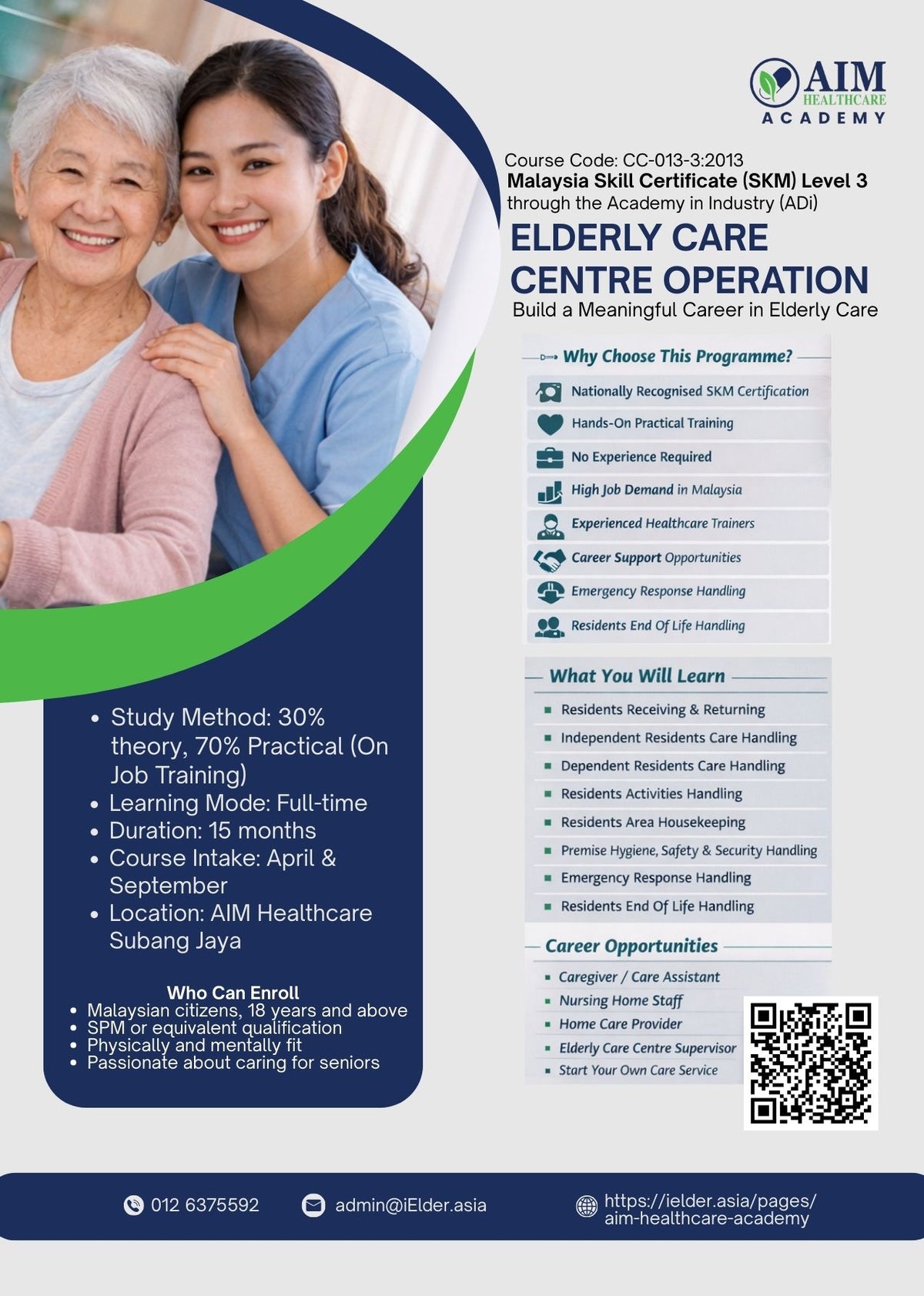 As Malaysia's population ages, professional elderly care is becoming essential. This nationally recognized certification ensures caregivers have the skills and compassion needed to provide quality institutional care when families need support.