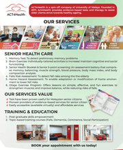 ACT4Health是马来亚大学的一家衍生公司,也是马来亚大学医学院老龄化和年龄相关疾病研究小组的业务部门。成立于 2017 年,为临床研究以及提供循证测试和治疗以及跨学科培训提供有利的场所